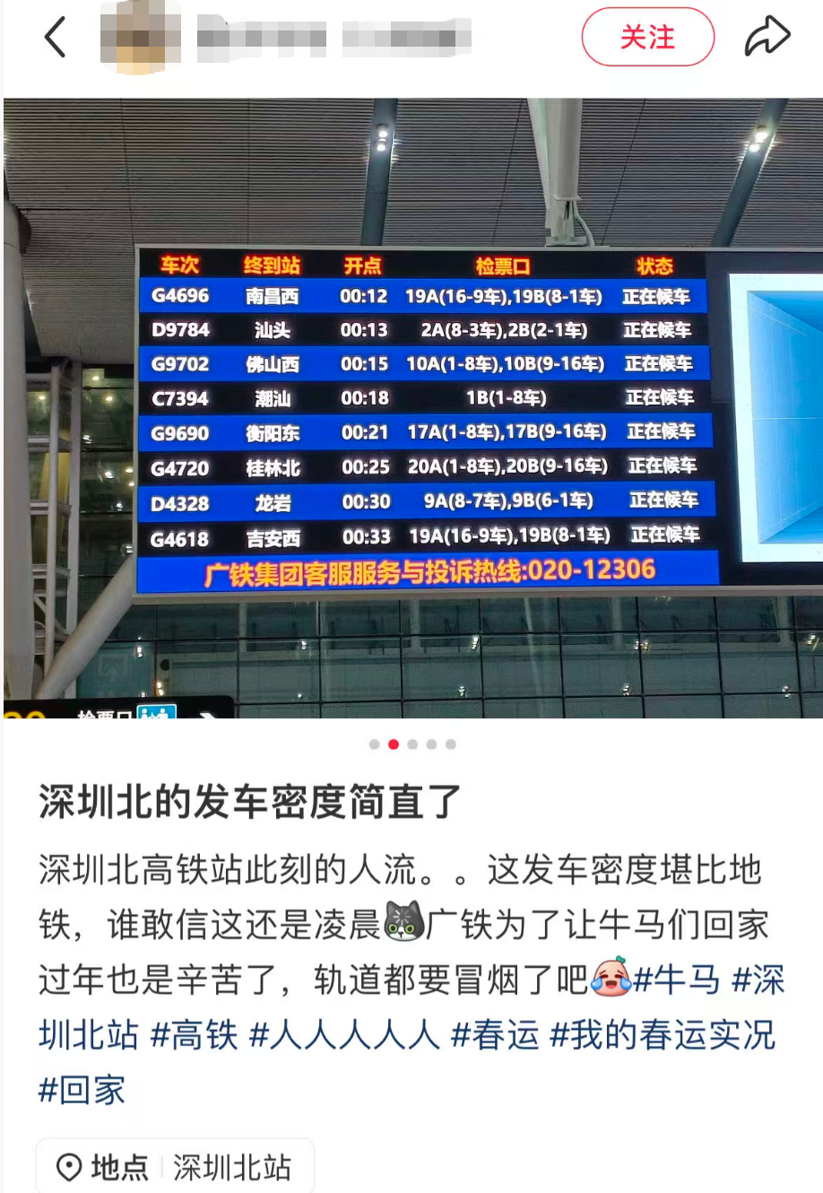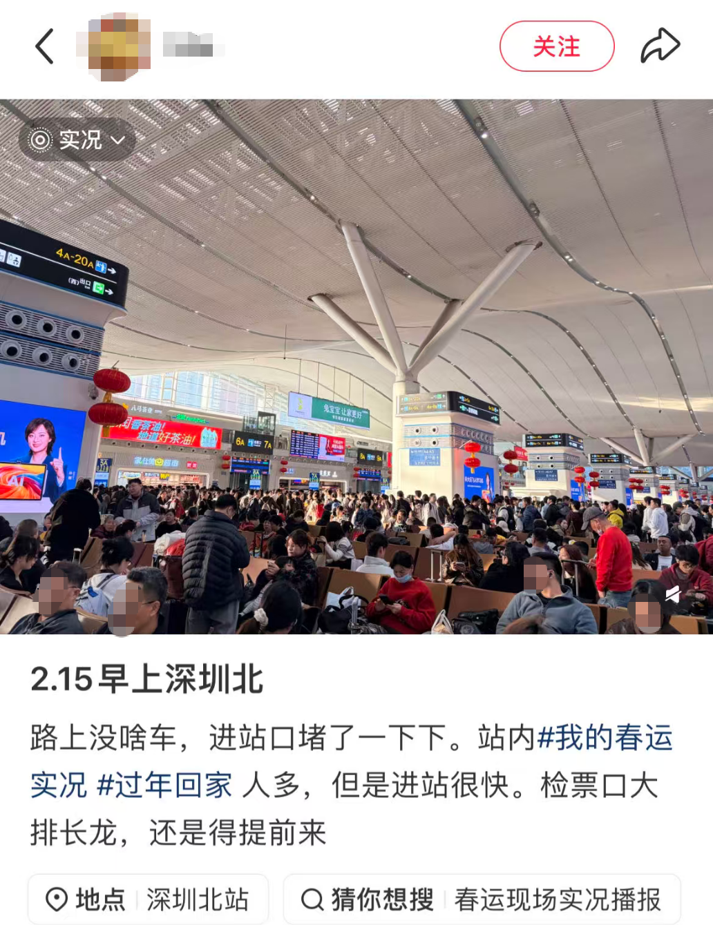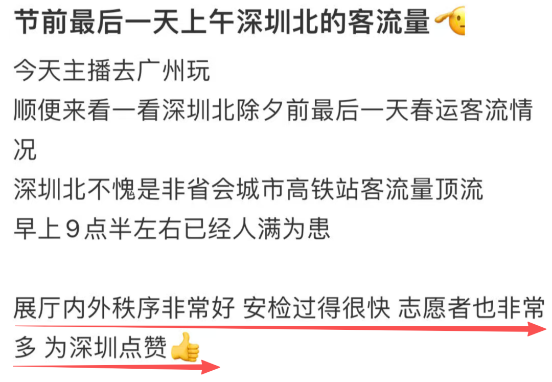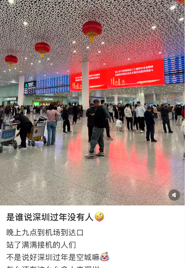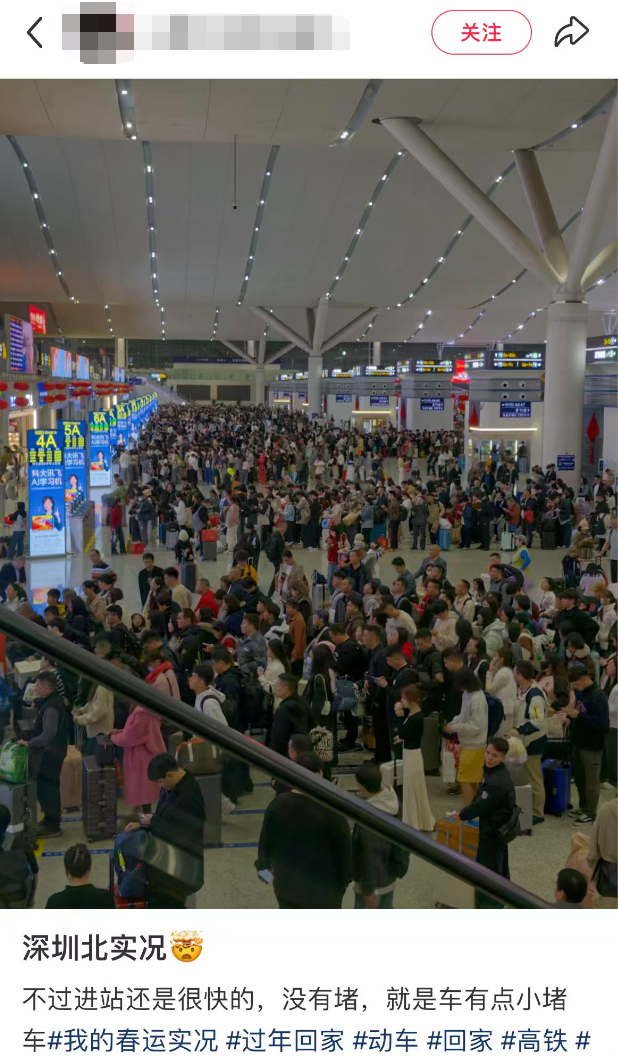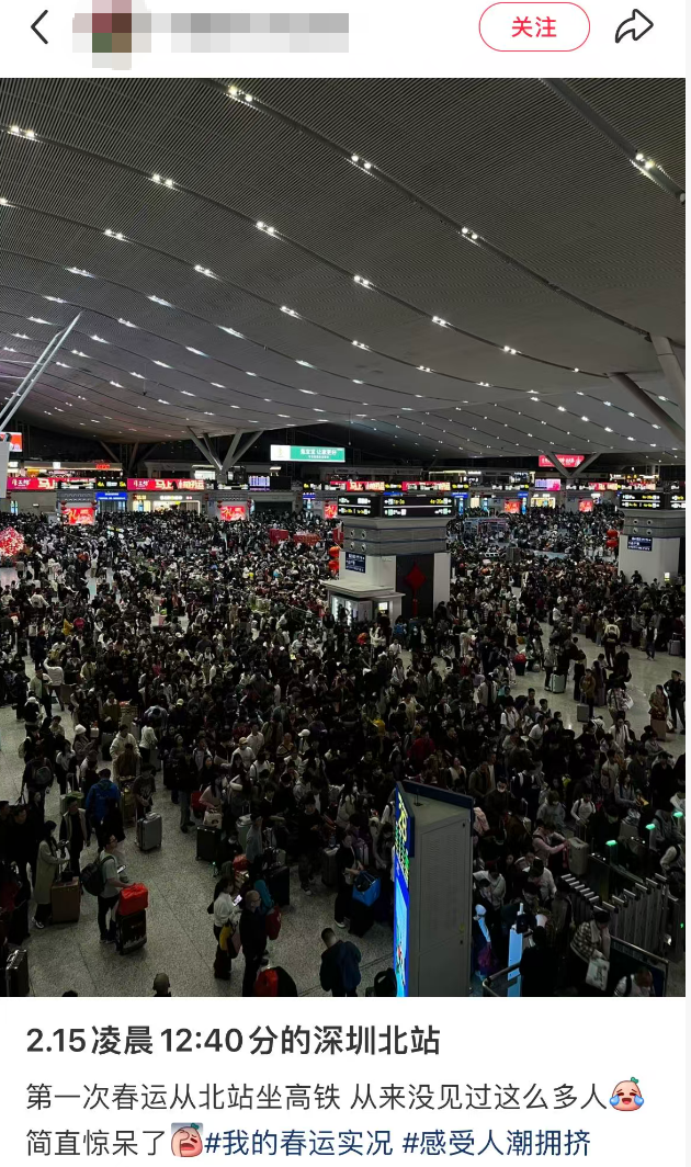 今日一早,多位网友在社交平台分享深圳北站的春运景象,直呼 “春运太夸张”。从网友发布的现场图片中可直观看到,站内人头攒动、客流密集,“人从众” 的热闹场景扑面而来。
